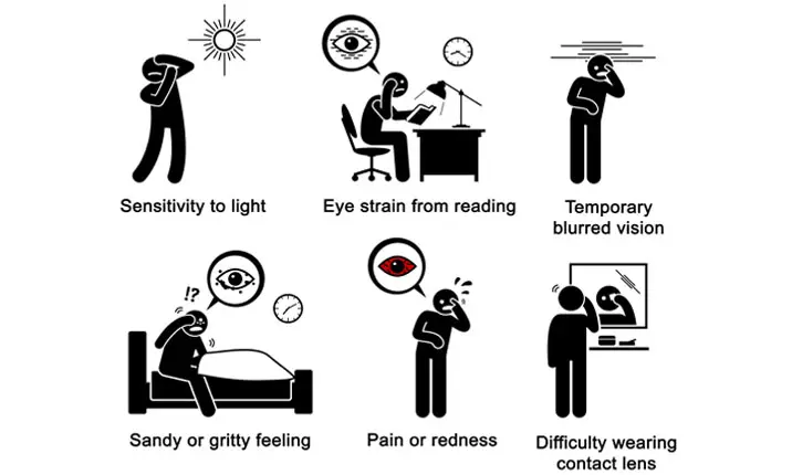 Prolonged periods of screen time encourage insufficient blinking. Windy, smoky, or dry environments increase tear evaporation. Laser refractive eye surgery (LASIK) may worsen dry eyes.