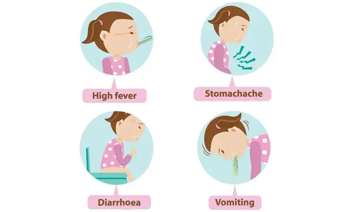 The usual symptoms for stomach flu include watery diarrhoea, stomach cramps, nausea, vomiting and sometimes fever. In children, a stomach flu can cause dehydration very quickly so it's important to be on the lookout for symptoms such as dry skin, dry mouth or being very thirsty. For babies, do look out for fewer and drier diapers, which could point to dehydration.