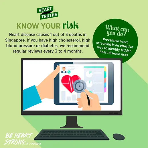 If you have high cholesterol, high blood pressure or diabetes, we recommend regular reviews every 3 – 4 months. Also go for a heart screening if you develop chest pains, especially when walking or climbing stairs.