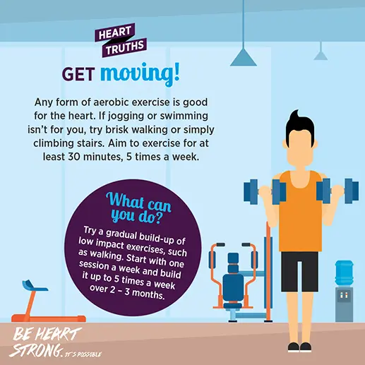 Any form of aerobic exercise is good for the heart. If jogging or swimming isn't for you, try brisk walking or simply climbing stairs. Aim to exercise for at least 30 minutes, 5 times a week.