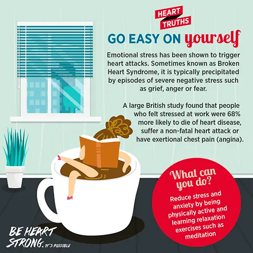Reduce stress and anxiety by being physically active and learning relaxation exercises such as meditation. Sharing your fears and worries with someone can also help to prevent depression. You can also reduce the effects of artificial stress on the heart by drinking less coffee and alcohol.