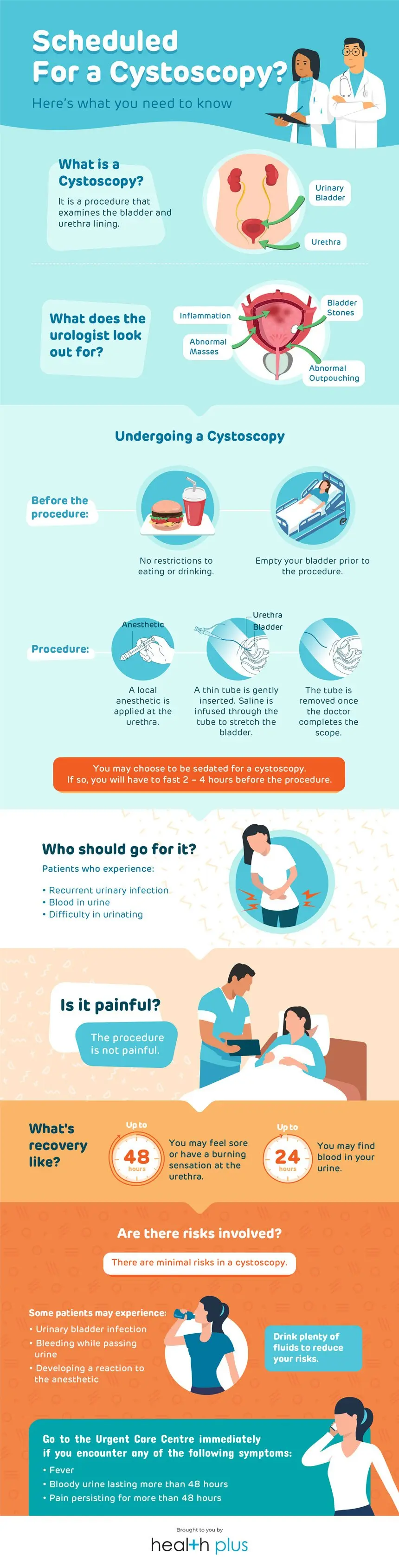 Cystoscopy is generally considered safe. There is a small risk of developing infection of the urinary bladder, bleeding while urinating or a reaction to the anaesthetic used. To reduce your risk for complications, your doctor will advise you to drink plenty of fluids after the procedure.