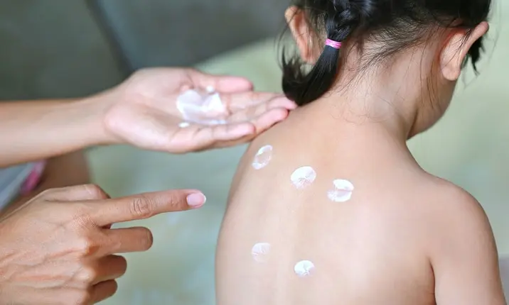 Gunakan tabir surya yang tidak menyebabkan sensitisasi seperti yang diformulasikan untuk wajah, yang biasanya lebih dapat ditoleransi pada anak-anak dengan eksim. Anda mungkin ingin melakukan 'uji tempel' dengan produk baru pada area kecil kulit untuk memeriksa apakah produk tersebut mengiritasi kulit anak Anda.