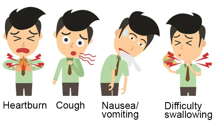 Penderita GERD dapat mengalami gejala yang disebabkan oleh asam yang mengiritasi dan merusak kerongkongan atau bagian belakang tenggorokan. Ini termasuk:
