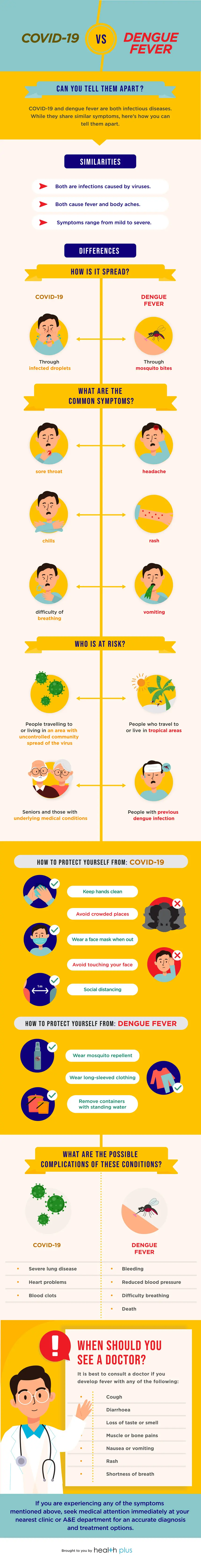Sulit untuk membedakan COVID-19 dan demam berdarah pada tahap awal penyakit ini. Jika Anda mengalami gejala-gejala parah yang disebutkan di atas, segera dapatkan bantuan medis di klinik terdekat atau Unit Gawat Darurat (UGD). Tes lebih lanjut atau penyeka hidung untuk COVID-19 mungkin diperlukan.