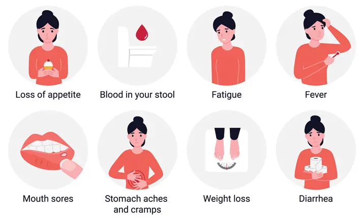 Gejala bervariasi, tergantung pada tingkat keparahan dan lokasi penyakit. Keluhan yang umum terjadi adalah nyeri perut, kembung, diare, kehilangan nafsu makan, penurunan berat badan, sering buang air besar atau kadang-kadang, tinja berdarah. Beberapa orang mungkin juga mengalami gejala lain seperti sariawan, mata merah, ruam atau nyeri sendi.