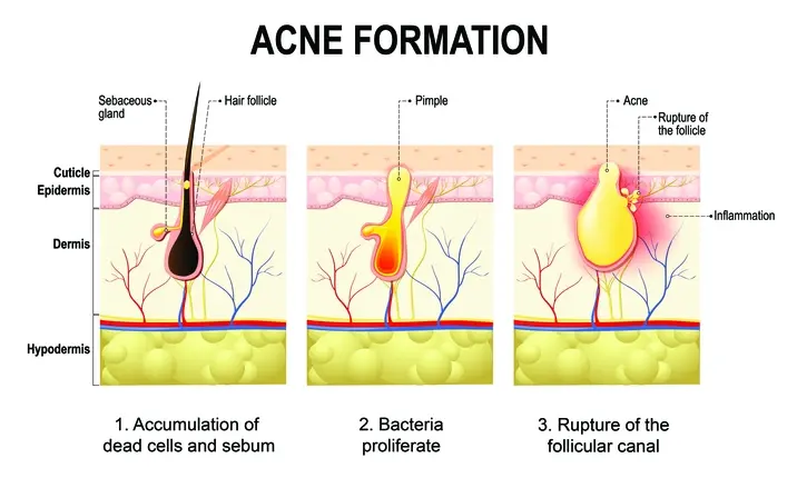 痤疮通常发生在皮脂腺(皮肤上的微小腺体)较多的部位,如面部、胸部和背部。有时,这些地方会分泌过多的皮脂(油脂),导致原本应该从毛囊中排出的死皮细胞粘在一起,堵塞毛孔。