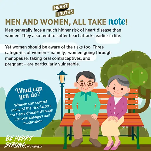 然而,女士也应该意识到这些风险。根据新加坡心脏基金会(Singapore Heart Foundation)的数据,心血管疾病是造成女士死亡的主要原因。有三类女士 – 即绝经期女士、口服避孕药女士和孕妇 – 特别容易患上心血管疾病。